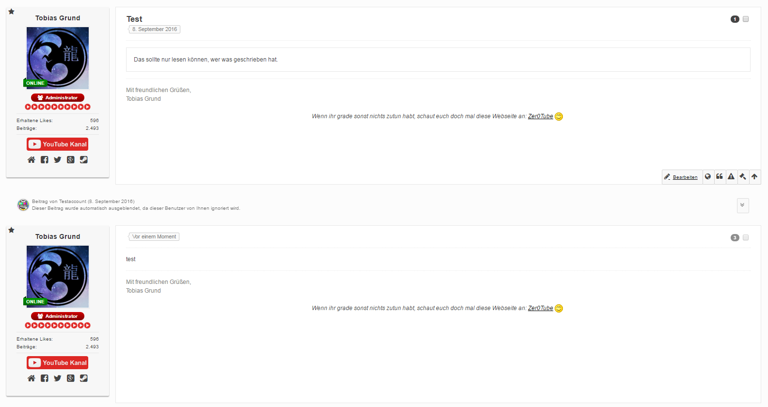 Ihr könnt das allerdings auch komplett abstellen, dann wird durch das Blockieren von Nutzern nur verhindert, dass diese euch anschreiben können, die Beiträge seht ihr aber trotzdem - so wie vorher halt. Einstellen könnt ihr das dort: https://ytforum.de/index.php/Settings/