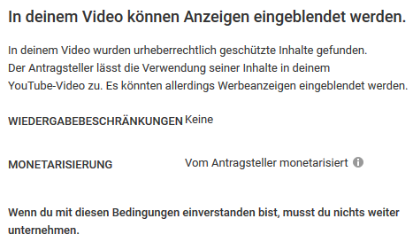 Erscheint der Punkt Urheberrechtshinweise (oder so ähnlich?), da sollte man erstmal gucken in wie fern es überhaupt beanstandet wird das Video. -