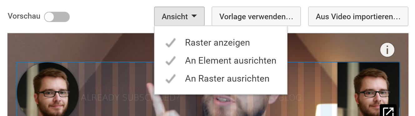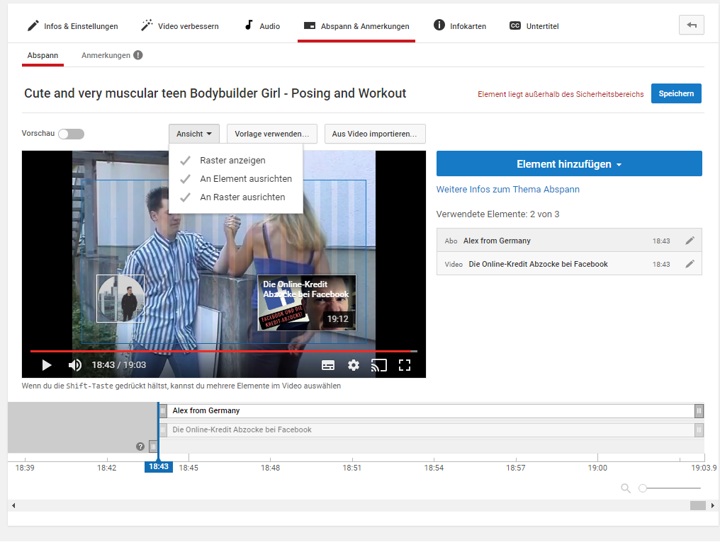 habe mal eine Frage: Bei meinem neusten Video würde ich gerne einen Abspann einfügen, mit Videovorschlägen und meinem Kanal. Dies klappte bei meinen Videos bisher tadellos, allerdings bekomme ich bei meinem neusten Video immer wieder die Meldung: "Element liegt außerhalb des Sicherheitsbereichs".