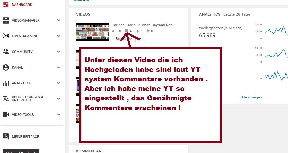 Hier habe ich Screenshot von diesen Problem fall ... so wie ihr auf den 3 Bildern sieht , bei Bild 1 , sieht man unter dashboard das unter dem Video 4 Kommentare sein soll , bei Bild 2 gehe ich unter Community -> Kommentare - > damit ich überprüfe was für kommentare das sind und ihr sieht es selbst auf den screenshot kein Eintrag kein Kommentar zu sehen , bei Bild 3 unter dem Video sollte eigentlich ein Blauer Meldung sein mit "Genehmigen Prüfen" text ... aber kein Meldung vorhanden , aber unter Dashboard bei Bild 1 sieht ihr , das 4 Kommentare abgegeben wurde .