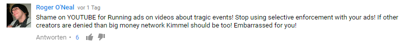 Die Regeln werden zudem nicht konsistent verfolgt. Absolute Willkür wohin man nur schaut. Wie kommt es zb, dass Youtuber wie etwa Ricegum noch immer Werbung auf ihre Videos bekommen, obwohl sie offensichtlich gegen so ziemlich alle Regeln verstoßen? Wie kommt es, das Jimmy Kimmel, obwohl sensible Themen ja angeblich nicht erlaubt sind, trotzdem sein Video vom Las Vegas Massaker monetarisieren kann? Und dann kommt sein Video auch noch auf Platz 1 auf Trending. Lol.