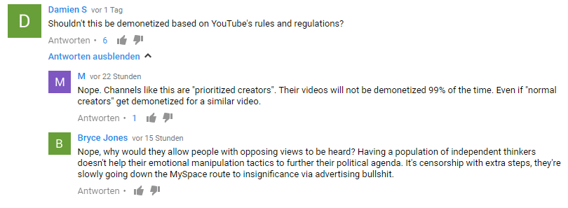 Abschließend zusammengefasst, ich empfinde es als eine absolute Frechheit was gerade mit Youtube passiert. Wie schon in einem anderen Thread erwähnt, es gibt tausende Menschen da draußen, die jahrelang all ihre Energie in ihren Kanal investiert haben und die jetzt vor dem Nichts stehen. Rückwirkend enteignet. So ein Vorgehen ist höchstgradig daneben und verwerflich und ZERSTÖRT MENSCHENLEBEN!