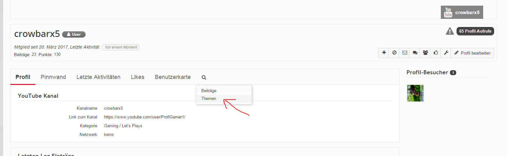 Klick mal auf deiner Profilseite in der Zeile unter dem Banner, in der Profil, Pinnwand, Benutzerkarte usw. steht auf die Lupe, dort kannst du nach Themen eines Nutzers suchen.