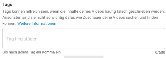 Wie könnte man auch auf die Idee kommen, dass es nicht wichtig sei? Wenn YouTube es nur direkt neben die Eingabe-Box für Tags schreibt und die Eingabebox auch noch hinter einem "für weitere nicht so wichtige Dinge hier klicken" Link versteckt. Wenn es wirklich wichtig wäre, würden sie es bestimmt MITTEN REIN schreiben.... und rot, und blinkend ![]()