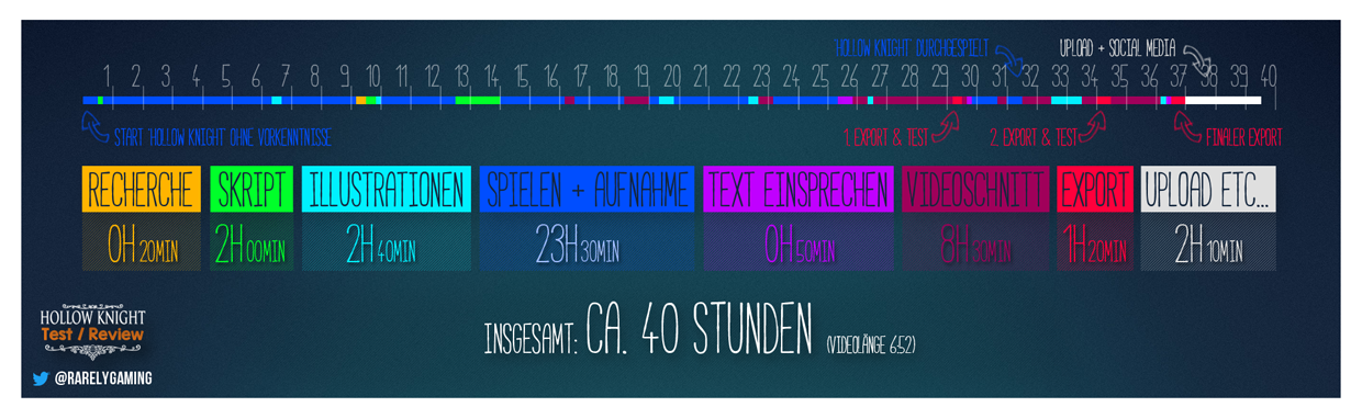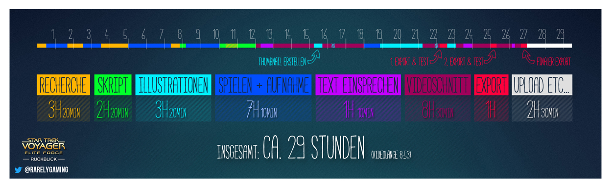 Dieses Thema hier im Forum: 'https://ytforum.de/index.php/Thread/14185-Wie-lange-sitzt-du-an-deinen-Videos/?pageNo=2' hat mich inspiriert meine Arbeitszeiten mal aufzuschreiben. Beim letzten Rückblick zu 'Star Trek Voyager - Elite Force' sah das dann so aus:Bei allen kommenden Videos werde ich das ebenso nachhalten. Mal sehen was dabei herumkommt