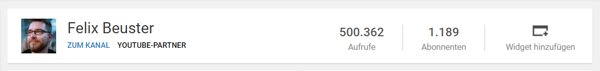 Laut Analytics sind's dank privater Videos sogar 517,000. Dazu gesellen sich über 1.2 Mio Wiedergabeminuten und fast 1,200 Abonnenten, so langsam geht's vorwärts.