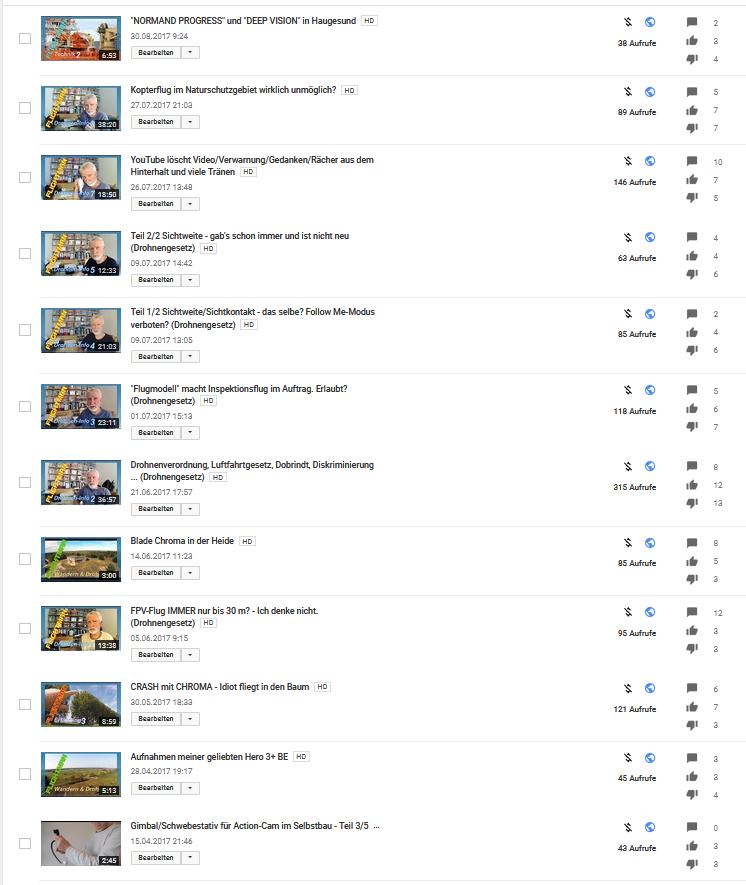 • Also Dislikes sieht man ja öfter mal. Und bei größeren Kanälen betrachtet man das als normal. Man denkt sich ja auch, dass die von unzähligen Leuten kommen. Nur bei mir scheinen die nur von 1 - 3 Leuten zu kommen. Evtl. hat nur 1 Person mehrere Kanäle. Und wenn ich mir jetzt vorstelle, der ackert sich durch meine 57 Videos durch und meldet sich dafür dann 3x ab und wieder an, oder hat sogar 3 Browser offen, um hintereinander weg zu disliken, dann würde ich so einen Menschen als krank bezeichnen. Und das nur, weil sein Guru keine Ahnung von Koptern hat und ich verhindern wollte, dass dessen Irrtümer sich verbreiten.