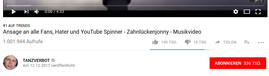 Jetzt ist schon klar, das dies wahrscheinlich der YouTuber Track des Jahres aus DE wird, da die Bewertung hier noch das wohl positivste Verhältniss anzeigt., im Vergleich mit den anderen. Tanzverbot scheint hier überzeugen zu können!
