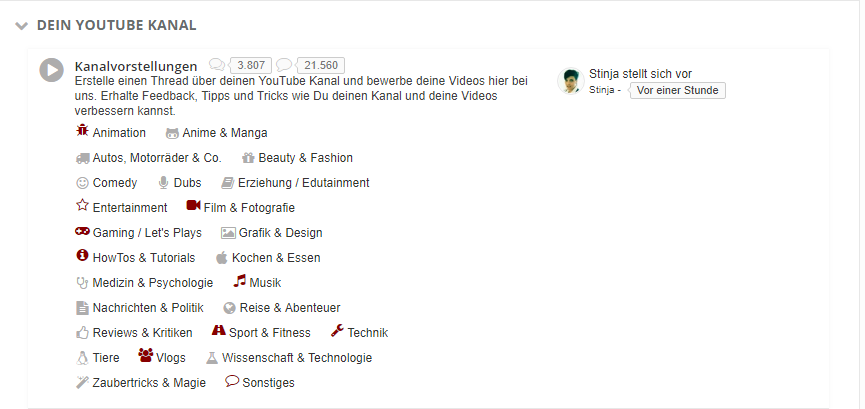 Also Generell wäre es für mich einfacher mich hier im Forum zurecht zu finden, wenn es sowas wie Kategorien gibt wie z.B. Gaming, Beauty, Vlogs etc. das man da drauf geht um dann die Neuigkeiten/Neue Themen einsehen zu können.