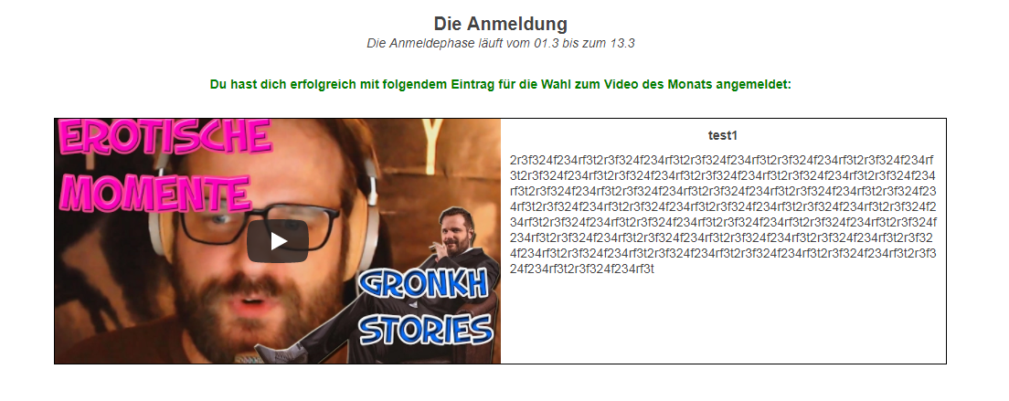 Keine Ahnung ob sinnvoll und umsetzbar - aber wäre es evtl. möglich nach etwa der halben Anmeldefrist die bisherigen Anmeldungen zu sehen? Es sind ja teils echt viele Videos mittlerweile - und so hätte man als "Abstimmer" schon mal etwas mehr Zeit reinzusehen?