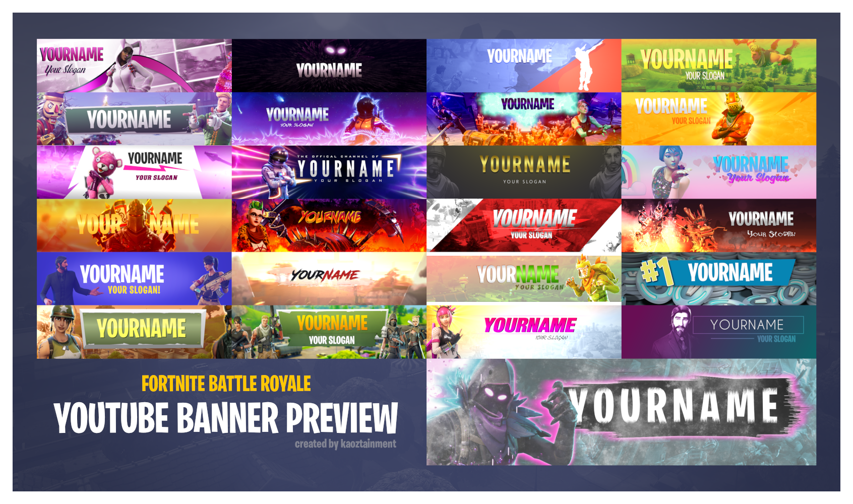 Da es aktuell gerade einen rießen Hype um das Spiel gibt und somit etliche YouTuber es spielen, darunter auch etliche Neue, die eben keinen eigenen Banner erstellen möchten/können. Habe ich hier für euch, ein Paket mit 25 YouTuber Banner Templates passend zur Thematik des Spiels: Fortnite Battle Royale!