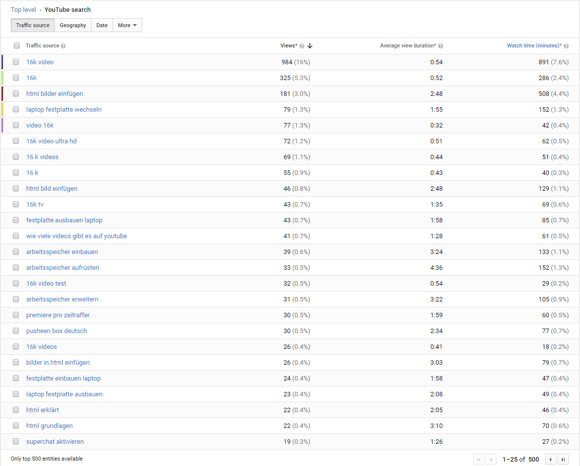 Wichtig ist dabei immer zu beachten, dass Keywords für mehrere Zwecke nützlich sein können, für die Suche und für suggested (rechts neben anderen oder den eigenen Videos). Und ich reserviere bei meinen Videos immer ca 75-80% vom verfügbaren Platz in Titel, Description und Tags für die Suchoptimierung und der Rest wird dann eventuell mit Kleinigkeiten für Suggested oder Verbesserung der ClickThroughRate (Eyecatcher zB) etc genutzt. Es gibt also Tipps, die man für Suggested anwenden kann, aber ich würde damit nicht all zu viel Aufwand betreiben. Die Suche sollte erstmal vorgehen, denn dort kommen die meisten neuen Zuschauer her, und dort gibt es die meiste Watchtime "abzuholen" gerade wenn man ein kleiner Kanal ist und noch am Anfang steht, wie fast alle hier im Forum. Die suggested Video Liste ist sehr nett, wenn man dort auftaucht, und wenn man es schafft bei großen Kanälen angezeigt zu werden auch extrem mächtig, aber das ist irgendwie Schritt 127 in einer langen Folge, wo man etwas optimieren kann als kleiner Kanal, und zu den kleinen Kanälen zähl ich mal grob alle, die unter 500k Watchtime Minuten im Monat machen.