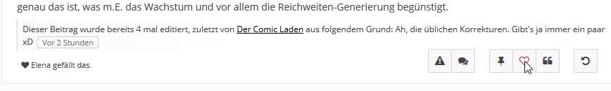 Normal müßte der Mauspfeil ein Mausover erzeugen, was nicht passiert und auch beim Klicken passiert gar nichts mehr. Bei allen anderen Posts funktioniert es und auch wenn ein Beitrag editiert wurde generell, von daher denke ich, dass es halt an der längeren Begründung liegt. Aber wenn sich jemand schon die Mühe macht, seinen Beitrag zu verbessern und dies auch noch begründet, sollte er ja nicht bestraft werden, dass man ihn weder liken noch zitieren kann (oder auch melden)