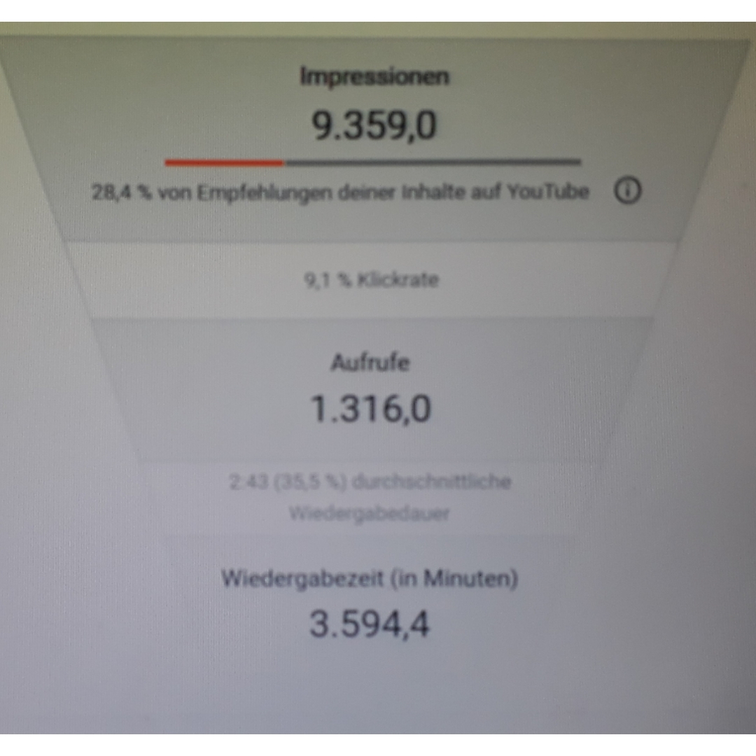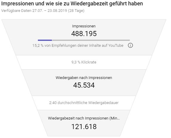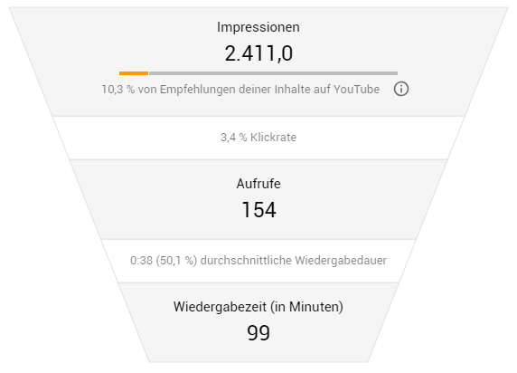 Sobald YouTube aber merkt, dass die CTR hoch ist und die Leute lange auf dem Video bleiben, wird es mehr empfohlen. Das führt dann natürlich zu mehr Impressionen, zunehmend mehr dann auch außerhalb der Zielgruppe. Die Leute klicken dann eventuell weniger auf die Thumbnails, dadurch sinkt die CTR dann natürlich wieder ein Stück. Die Werte müssen also immer alle im Zusammenhang gesehen werden, daher gibt es ja auch die entsprechende Trichter-Grafik in Analytics.