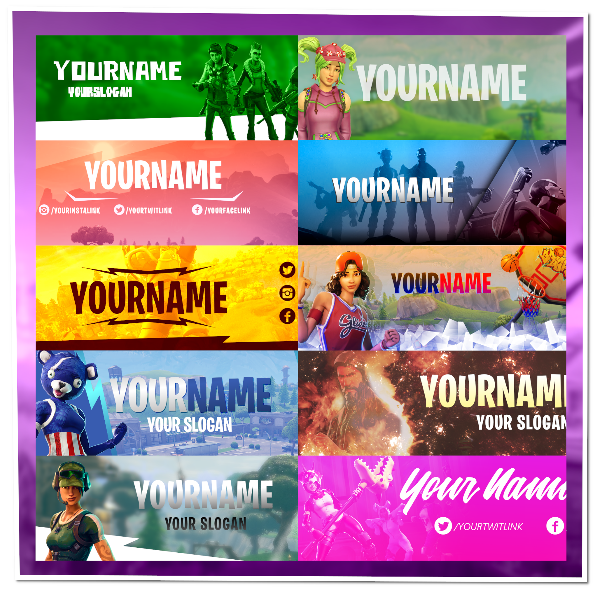 • Da es aktuell gerade einen rießen Hype um das Spiel gibt und somit etliche Streamer es spielen, darunter auch etliche Neue, die eben keinen eigenen Banner erstellen möchten/können. Habe ich hier für euch, ein Paket mit 10 Twitch Banner Templates passend zur Thematik des Spiels: Fortnite Battle Royale!