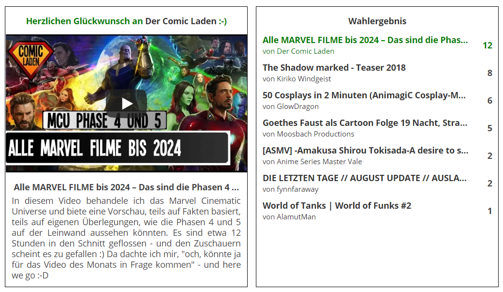 Wo kann man denn den Stand überhaupt einsehen? Ich bekomm immer nur die Videos angezeigt, für die ich gestimmt habe