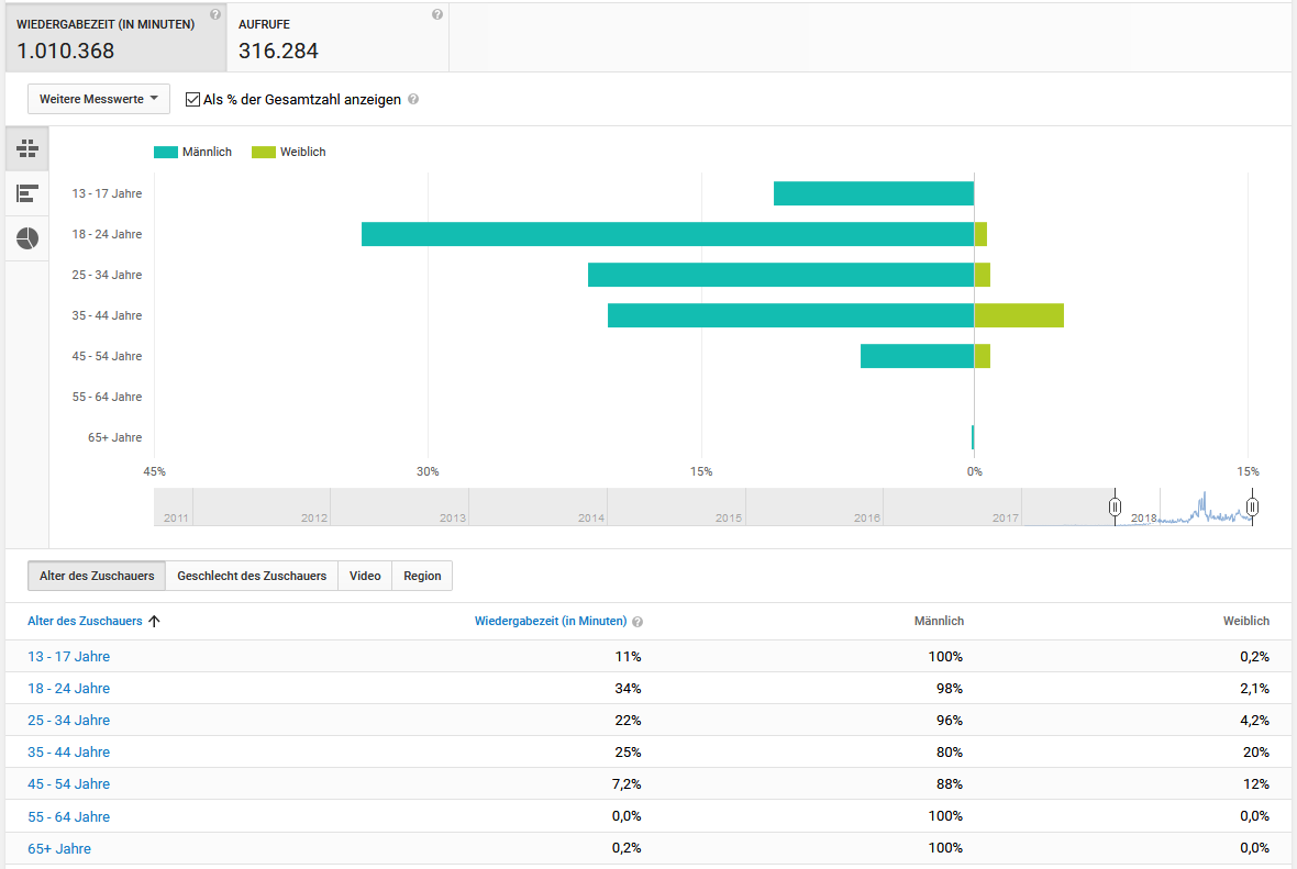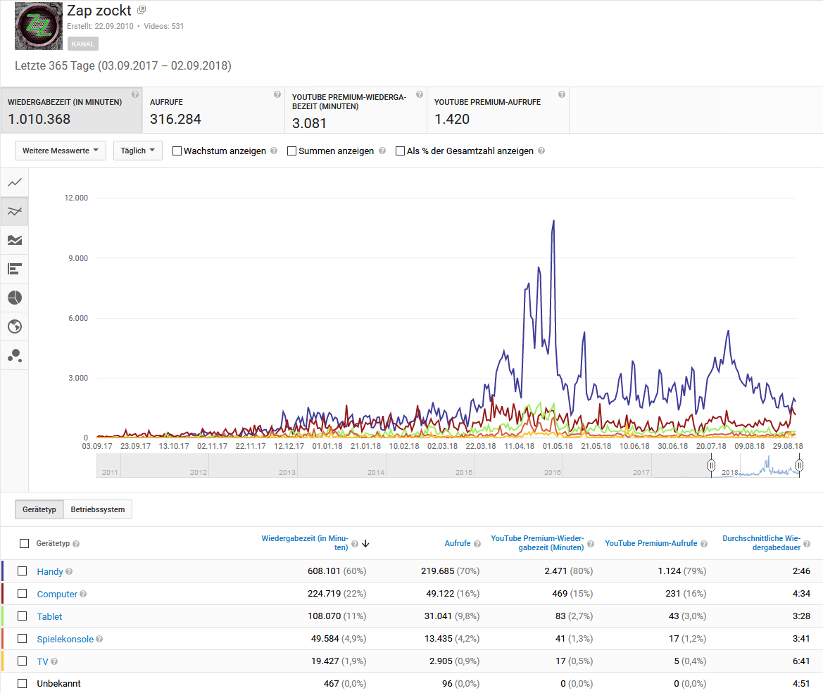 Aber da bin ich wohl mehr und mehr die Ausnahme, wenn ich mir meine Kanal-Statistik so anschaue (skaliert auf letzte 365 Tage):
