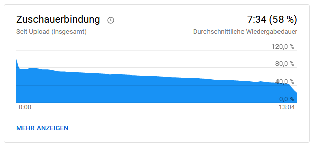 Der Graph zeigt an, an welcher Stelle des Videos wieviel Prozent der Zuschauer noch "anwesend" waren. Dies beginnt natürlich bei 100% in Sekunde 1 und fällt dann nach und nach ab. Wenn ein Verlauf so gerade aussieht wie hier, gab es wohl zumindest keine besonders "abschreckenden" Momente im Video, denn sowas kann man meistens als einen starken Knick nach unten sehen. So in etwa wie der am Ende, dort haben viele Zuschauer bemerkt, dass das Video vorbei ist und nur noch Abspann kommt, da haben sie vorzeitig weggeklickt. Wenn so ein Knick mitten im Video vorkommt, dann ist an dieser Stelle vermutlich etwas nicht in Ordnung gewesen. Schlechter Ton, besonders langweiliger Moment, eine Aussage die viele Zuschauer nicht gut fanden, das kann viele Gründe haben.
