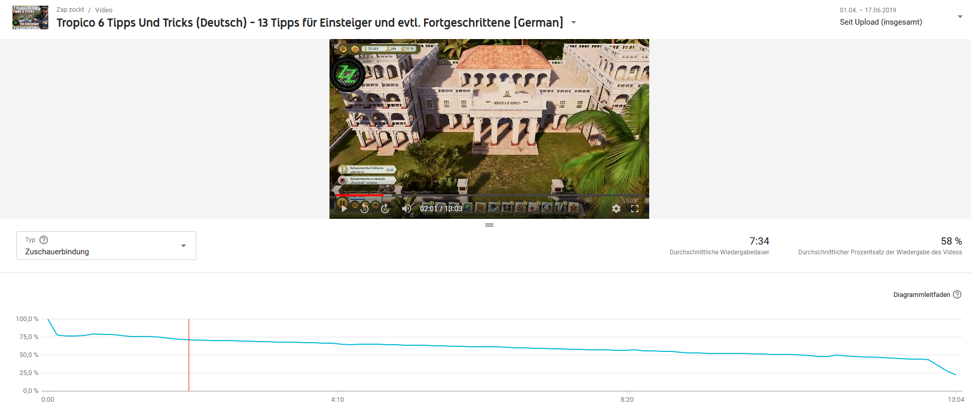 Dies ist ein recht erfolgreiches Video, das eigentlich eine Gesamtlänge von 13min und 4sek hat, wie man unten rechts sehen kann. Alle Zuschauer im Durchschnitt haben es 7min 34sek geschaut.