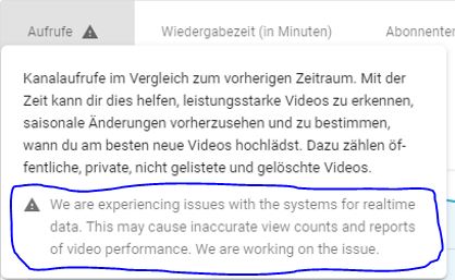 seit rund 48 Stunden sind bei mir die Aufrufzahlen völlig verbuggt. Die Echtzeitanalytics zeigen Gesamtzahlen an, die nicht der Einzeladdition entsprechen, die Zahlen im Betastudio sind nochmal anders und die Aufrufzahlen auf den Videos selbst sind (wie immer) nochmal anders, liegen aber ausgerechnet da viel höher als in den Studios (ist ja sonst andersherum).