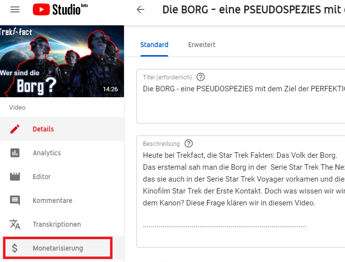 Schritt 2: Nun bis du in der Detailsansicht zu deinem Video. Sofern du monetarsiert bist steht im Menü "Monetarisierung". Einmal bitte kicken.