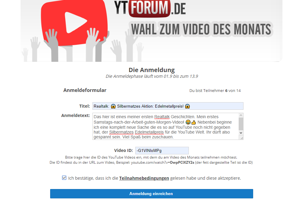 ) und ich wünsche allen anderen Teilnehmern viel Erfolg und möge das bessere Video gewinnen!Viele Grüße