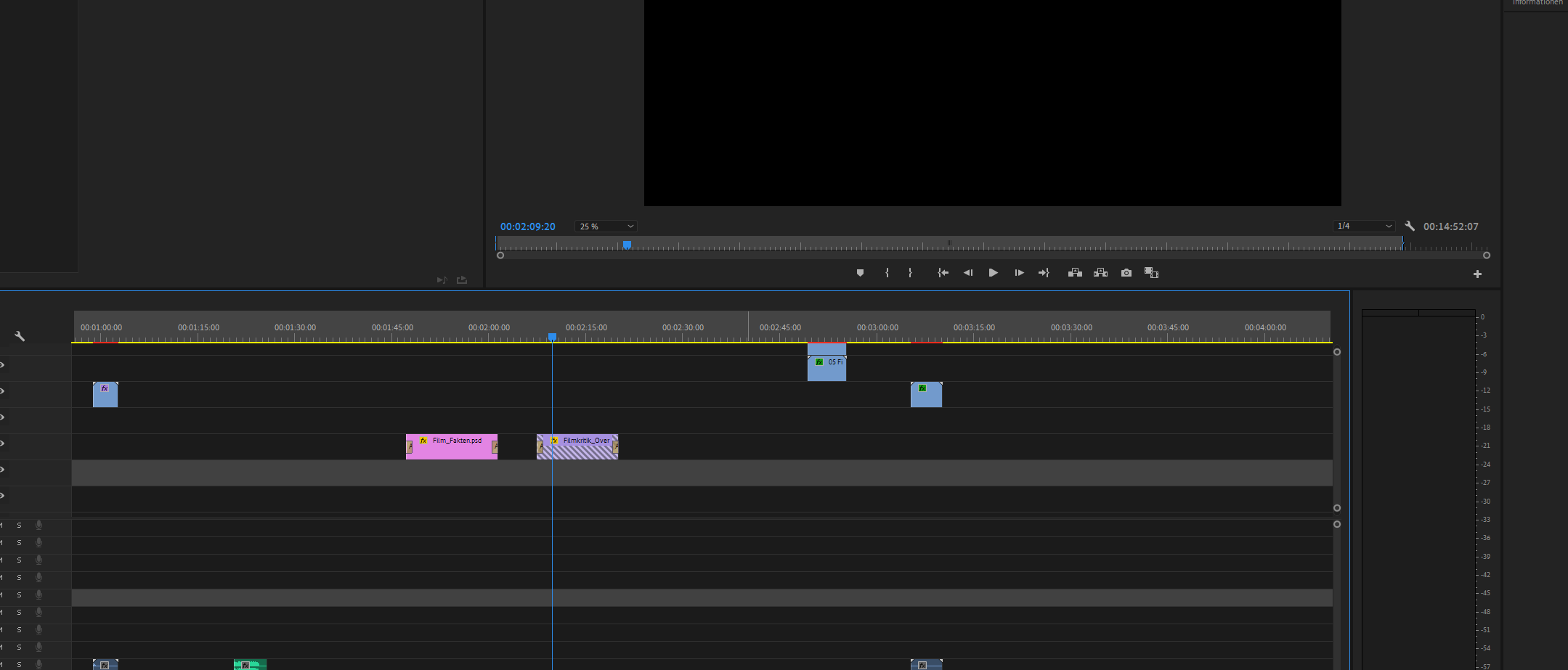 hab folgendes Problem. Ich habe ein Overlay, welches mir bis dato in meinen Vids immer angezeigt wurde. Seit vorgestern wird es mir nicht mehr angezeigt, die Datei in der Timeline nun lila unterlegt, und weißs schraffiert. Google is ausnahmsweise mal nicht mein Freund, gehe davon aus das ich eine Tastenkombi gedrückt habe, die dieses Problem verursacht hat. Ob in Photoshop oder Premiere - ich tendiere zu Photoshop. Wenn ich die Datei nämlich in Premiere re-importiere, selbes Problem + ich kann die Datei in der Timeline nicht mehr über die Zeit strecken...kP!