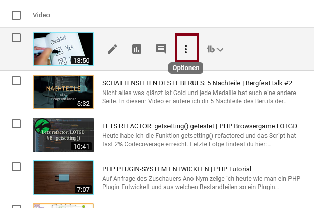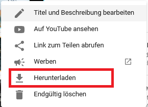 in Youtube Studio, da wo du die Liste der Videos hast, da kannst du ja über jedes Video hovern und dort auf die drei punkte drauf klicken, es öffnet sich ein kleines Popup und da gibt es Herunterladen