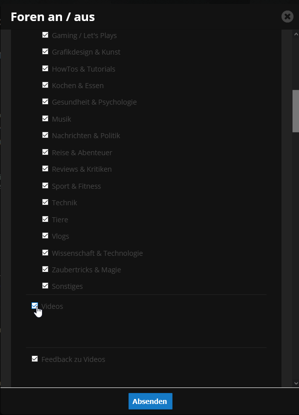 Wenn Du hier den Haken bei Videos rausnimmst, werden die Themen der Kategorie Videos komplett ausgeblendet.