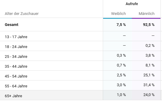 Und was ich mit in die völlig falsche Richtung gehen meine ist das ihr hier versucht eure Zugriffszahlen anhand von Zielgruppenalter zu analysieren und Impressionen welche durch ein neues Video entstehen.
