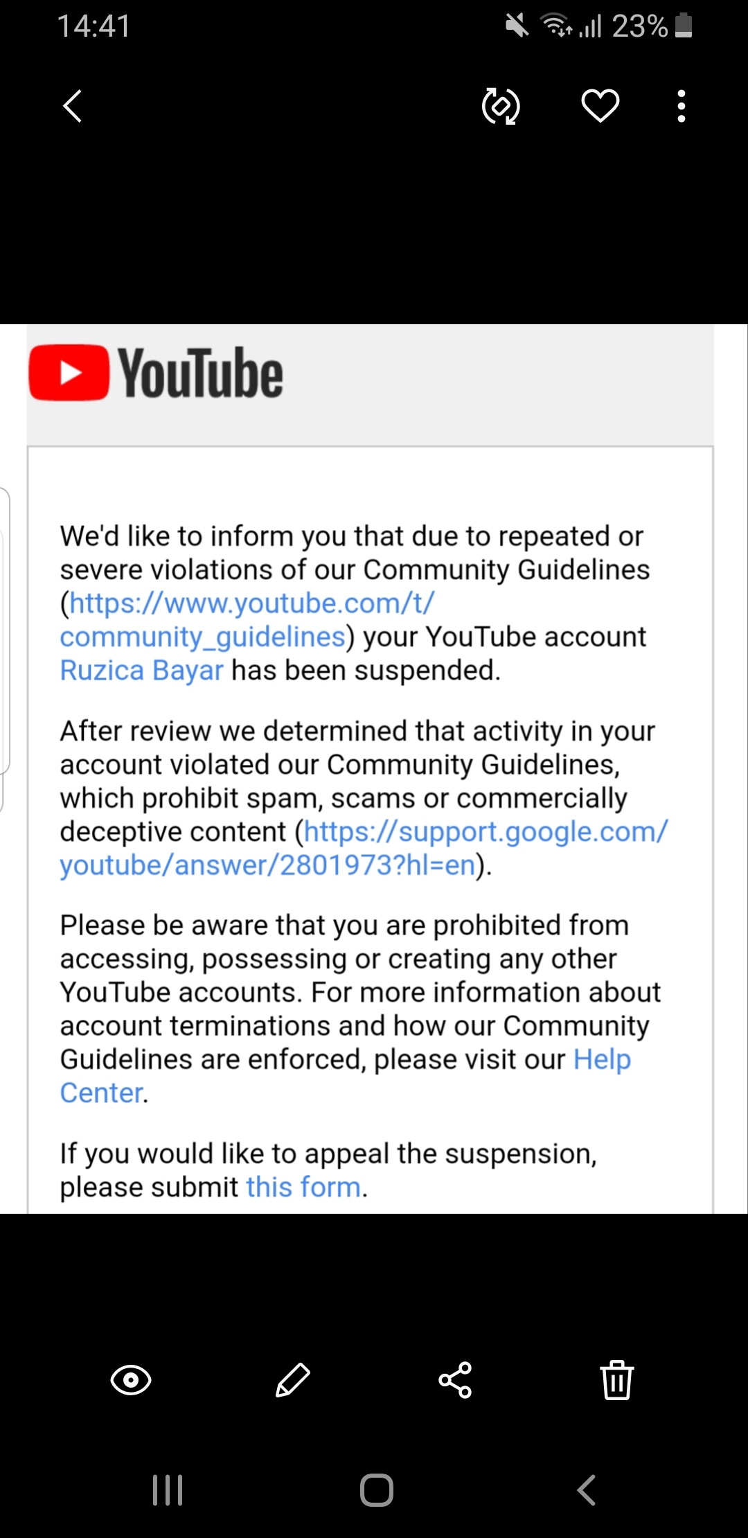 Hallo, ich hoffe es kann mir wer helfen bitte. Mein Account wurde vor 3 Tagen gelöscht ohne Vorwarnung oder etwas,bin etwss geschockt. Habe eine Email bekommen das Youtube gesperrt ist.