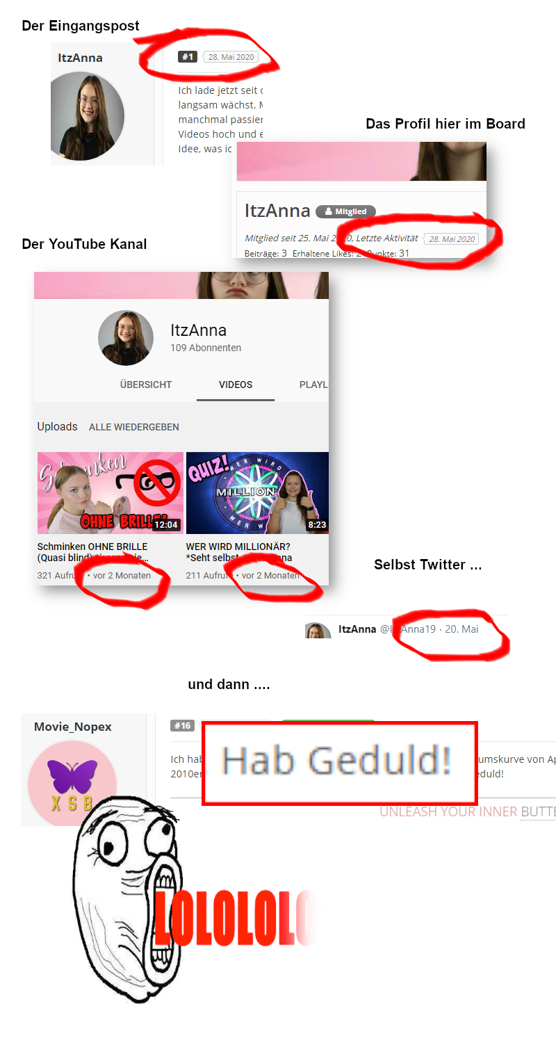 Klar gibt es Nischen, wo 100 Subs in 2 Monaten, wie ein Wunder wirken kann (was eben da auch an der kleinen Größe der Nische liegt) oder eben für uninformierte und unambitionierte Creator so wirken mag. Aber in eben jenem Genre (Welches mehrere Millionen User anspricht) mit den Voraussetzungen (Junges Mädel mit einem Casual Look,, die sich vor der Cam zu präsentieren weiß), hätte Anna hier schon mehr (viestelliges) raus holen können.