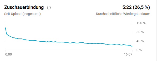 Beispiel (Video mit 14:04 Minuten und 5:29 Durchnittlicher Wiedergabedauer) : (5*60+29) / (14*60+4) * 100 = 38,98%