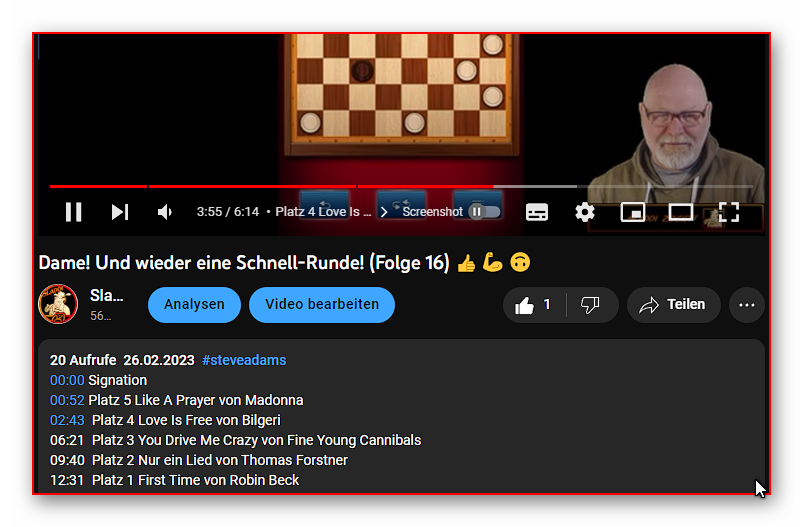 Eben wollte ich mein heutiges Video nochmal gegenprüfen, was ich nach der Veröffentlichung immer mache, um sicher zu gehen, dass alles so funktioniert wie es soll und normalerweise war das auch immer der Fall, nur heute sind aus unerfindlichen Gründen die eingefügten Videokapitel verschwunden bzw. nicht oben in der Player-Suchleiste zu sehen, obwohl ich sie wie vorgegeben (und wie sonst auch) in der Videobeschreibung aufgelistet habe.