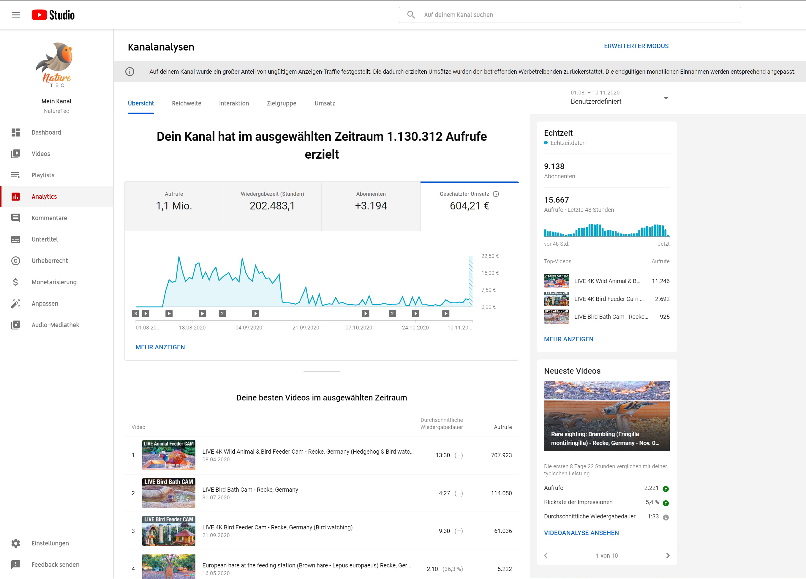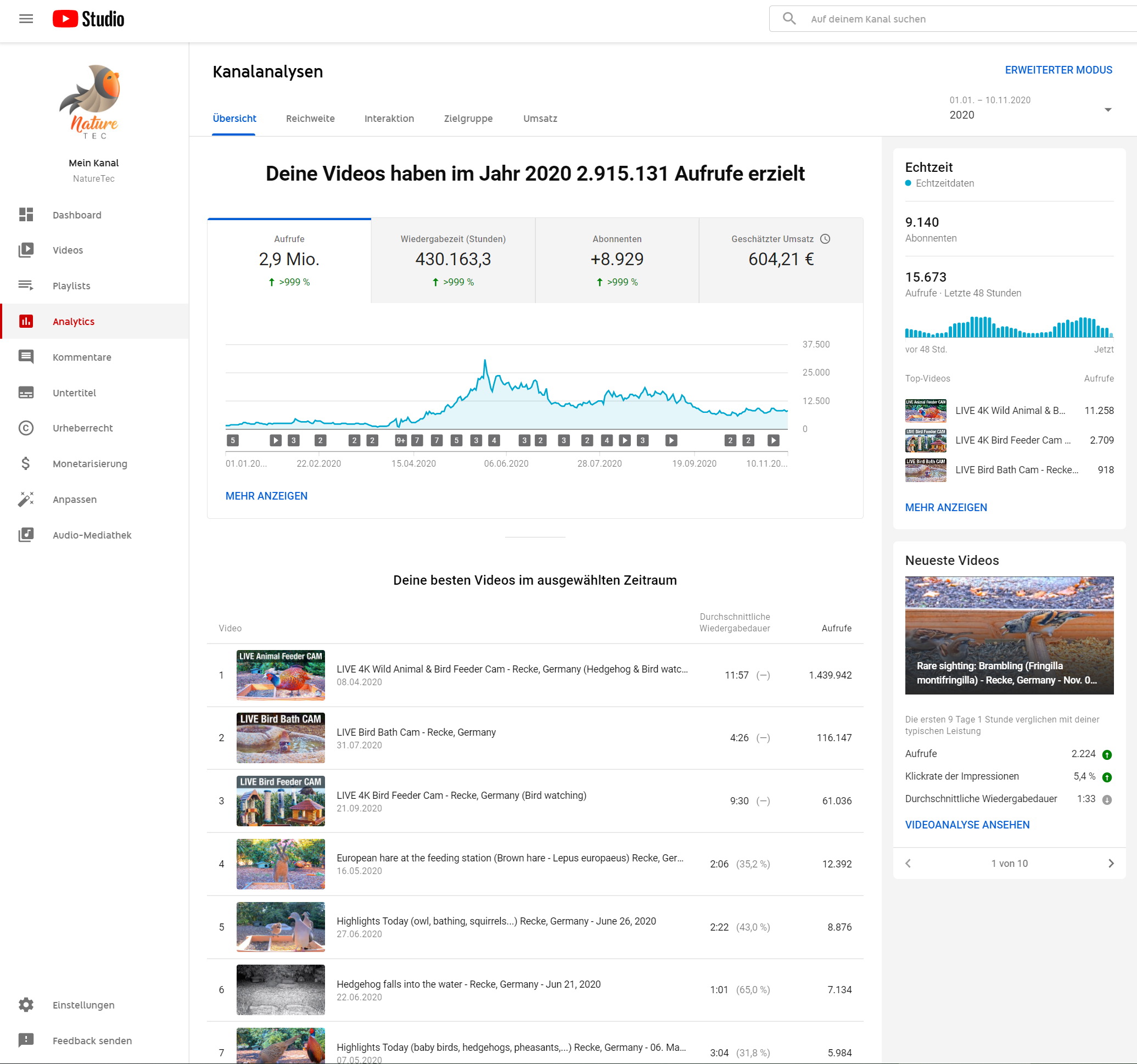 In diesem Frühjahr waren meine Nistkästen sehr beliebt - mit ca. 600.000 Aufrufen im Monat - da war noch keine Monetarisierung aktiviert.