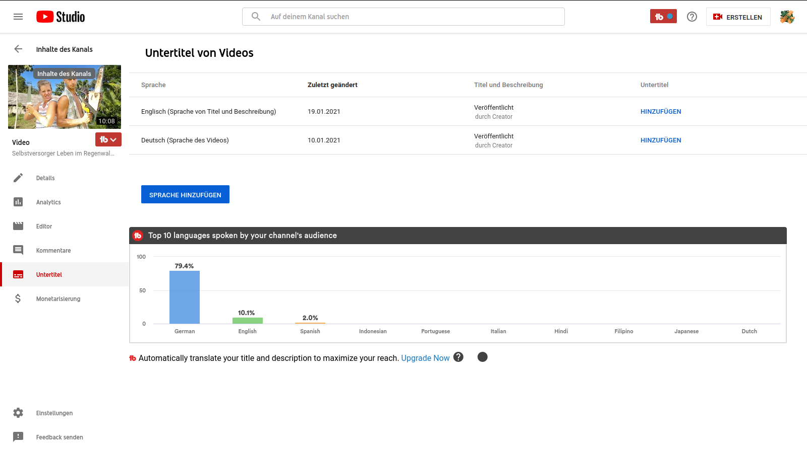 Der ein oder andere fragt sich bestimmt für was das wichtig ist? Ich möchte gern den Titel und die Beschreibung bei allen Videos wo nicht gesprochen wir auf Englisch übersetzen. Wenn ich jetzt bei der Uploadsprache alles auf Englisch eingeben würde und als 2. Sprache deutsch, dann zeigt es mir in der Suche bei Youtube die Videos nur mit Englischen Titel an. Ich habe in sämtlichen Einstellungen mehrmals nachgesehen (auch bei google) und es ist alles auf deutsch eingestellt.