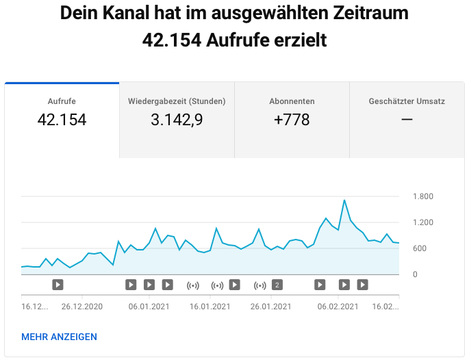 Richtig angefangen mit YouTube habe ich dann Mitte Dezember 2020, von da an zwei Videos pro Woche hochgeladen. Jetzt haben wir Mitte Februar. In diesen zwei Monaten habe ich fast die kompletten Voraussetzungen für das YouTube Partnerprogramm erfüllt.
