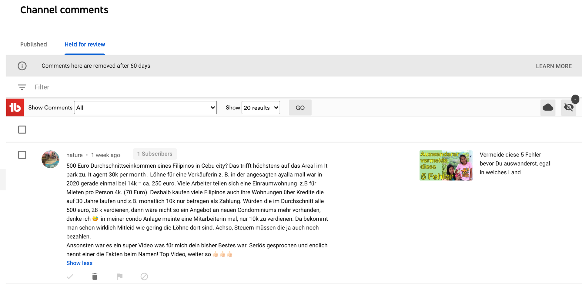 bei mir werden neuerdings auch vermeintlich Kommentare geblockt, die aber noch eins zu eins im Dashboard und unter dem Video selbst zu sehen sind. :o