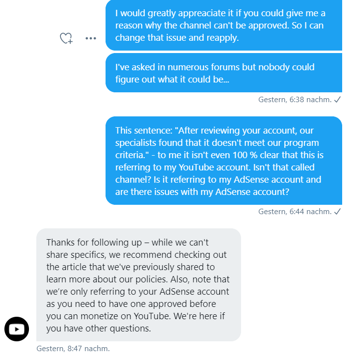 Kann mir hier bitte jemand weiterhelfen, was ich hier tun kann? Wurde hier tatsächlich mein YouTube-Kanal abgelehnt oder gab es einen technischen Fehler bei der Verknüpfung der beiden Konten? Ich bin hier sehr über die generischen Fehlermeldungen und Mails von Google und YouTube verwendet.