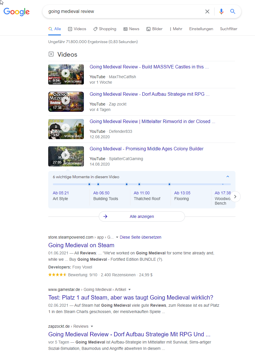 habe eben eine Recherche in der YouTube suche durchgeführt. Normalerweise werden ja der Titel eines Videos und die ersten Sätze der Videobeschreibung bei einer Suche berücksichtigt und darauf basierend werden Videos vorgeschlagen. Mein SEO-Wissen ist noch auf dem Stand, dass die wichtigsten Keywords in den Titel und in die die erste Zeile der Videobeschreibung gehören, damit ein Video gefunden wird. So weit, so gut.