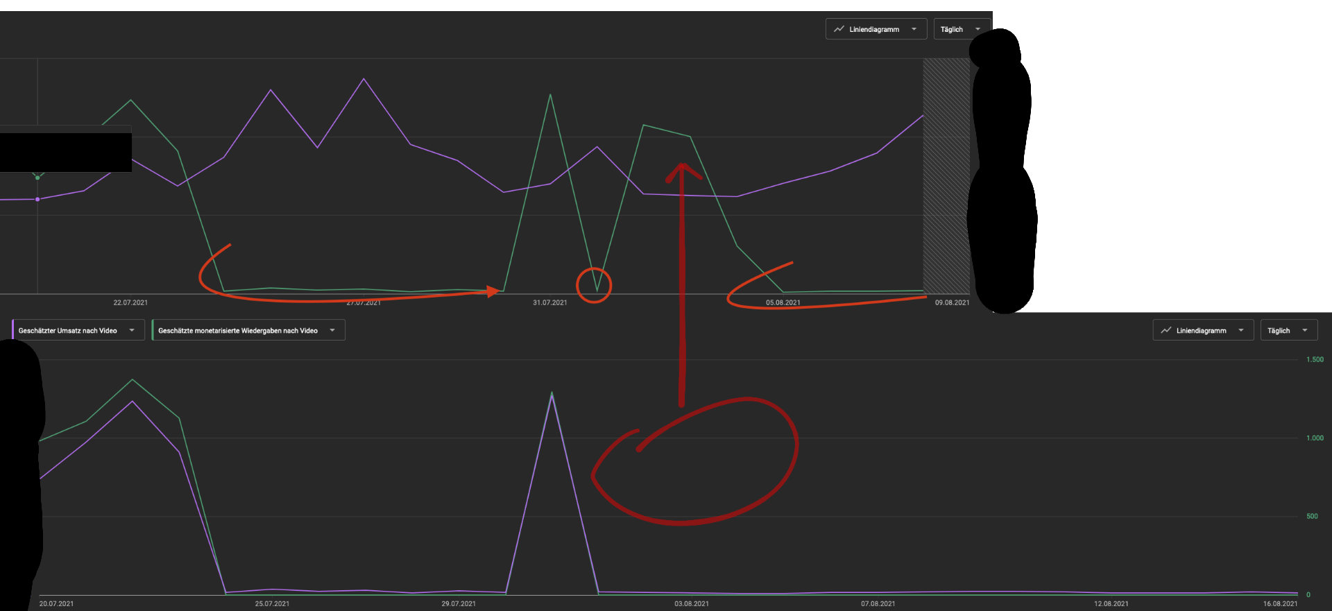(Der obere Screenshot ist älter, der untere Screenshot entstand wenige Tage später - der Revenue vom 01.08 - 05.08 ist verschwunden.) (Revenue ist oben GRÜN, unten LILA)