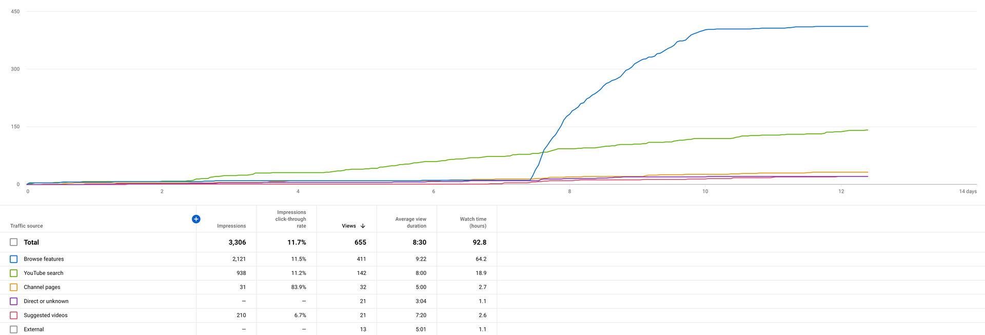 „solange das Video die CTR und %retention halten kann, wird der Kreis der potentiellen Zuschauer immer weiter vergrößert.“