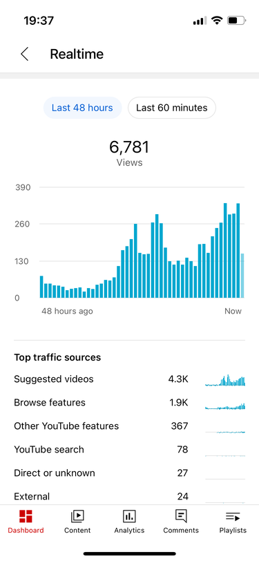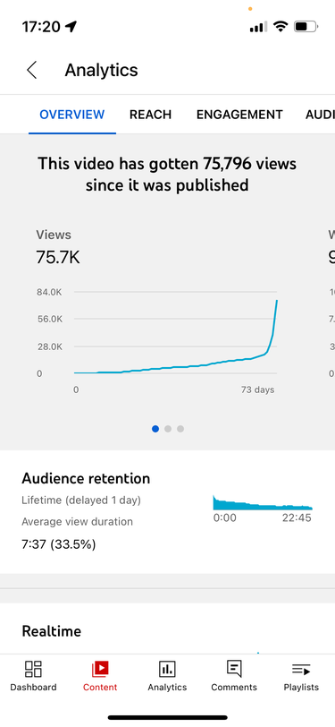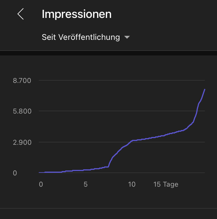 Leider gab es nur genau einen Tag an dem meine Impressionen stark anstiegen, nämlich am 7 Tag nach der Veröffentlichung. Ich hätte ehrlich gesagt gedacht, dass mein Video mit den KPIs stärker promoted wird und bin etwas verwirrt, weil ich schlecht einschätzen kann, wie es weitergeht. Habt ihr ähnliche Erfahrungen gemacht? Ist es normal, dass YT ganz kurz stark promoted und danach nicht mehr? Kommt nach eurer Erfahrung eine zweite Promotion oder wars das jetzt mit dem Video? Ich dachte eigentlich, dass YT das Video einer immer grösser werdenden Gruppe zeigt, wenn retention und ctr konstant bleiben..