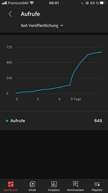 Nach 9 Tagen hat mein Video 600 Aufrufe, 20 Abonnenten, 28 likes und 15 Kommentare generiert.