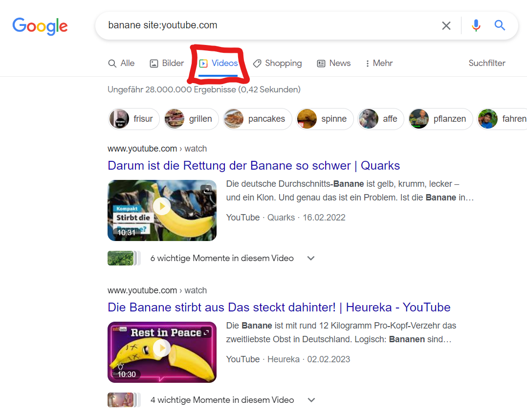 Als Ergebnis erhalte ich sieben Videos. Dann beginnt der Müll mit "Nutzer haben auch gesehen" mit 13 Videos ohne Bezug und Belang. Danach mit "Für mich" mit fünf Videos ohne Bezug und Belang. Danach folgt "Schon angesehen" mit drei Videos ohne Belang. Danach erfolgen die restlichen Videos, wobei der gesuchte Begriff hier nur manchmal in den Metadaten des Videos enthalten ist, aber oft überhaupt nicht vorkommt. Das Arbeite mit Operatoren scheint keinen Untersched zu machen.