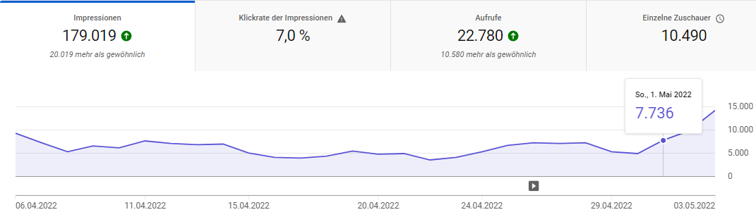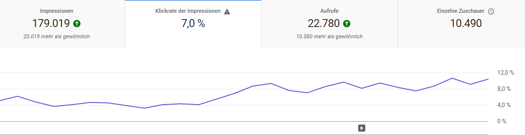 zuerst einmal freue ich mich über die Entwicklung meiner Aufrufzahlen. Kann diese aber leider nicht nachvollziehen. Die Aufrufe haben sich aktuell fast verdreifacht. Allerdings nicht nur durch Impressionen. Die sind nur leicht angestiegen, beziehungsweise in den Tagen vorher gar nicht. Meine Klickrate hat sich mehr als verdoppelt. Ich habe weder Thumbnails ausgetauscht noch Titel geändert. Ich habe auch nur ein Video in den letzten 4 Wochen hochgeladen. Die Klickrate ist auch nicht nur bei einem Video nach oben geschossen, sondern ganz vielen. Habt ihr eine Idee? Ich kann mir das irgendwie nicht erklären..