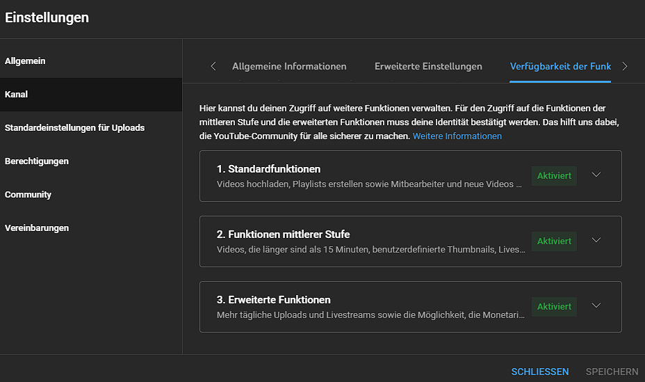 Das wiederum siehst du im YT-Studio Einstellungen Kanal Reiter "Verfügbarkeit der Funktionen" auswählen