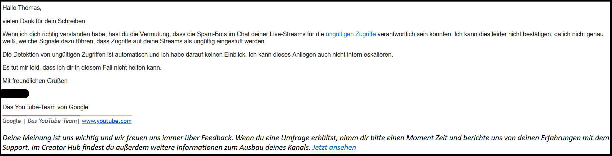 Ich habe mich also beim YouTube Creator Support gemeldet und bekam immer wieder die Aussagen, dass auf meinem Kanal "ungültige Zugriffe" erkannt wurden. Natürlich habe ich niemals in irgendeiner Weise dafür gesorgt, dass ungültige Zugriffe auf meinem Kanal generiert werden, weder durch Bots, noch durch gekaufte Klicks oder anderes Manipulationstechniken. Der Support sagte mir nur jedes Mal, dass ich als Creator dafür verantwortlich sei, dass diese ungültigen Zugriffe gestoppt werden...