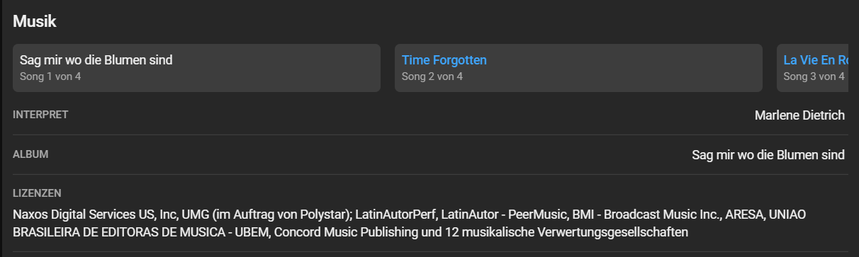 Bei dem von Steve genannten Video und seiner Einblendung zu "Sag mir wo die Blumen sind" teilt mir YT beim Video mit: "Es wurden urheberrechtlich geschützte Inhalte gefunden. Der Urheberrechtsinhaber erlaubt, dass die Inhalte auf YouTube verwendet werden."