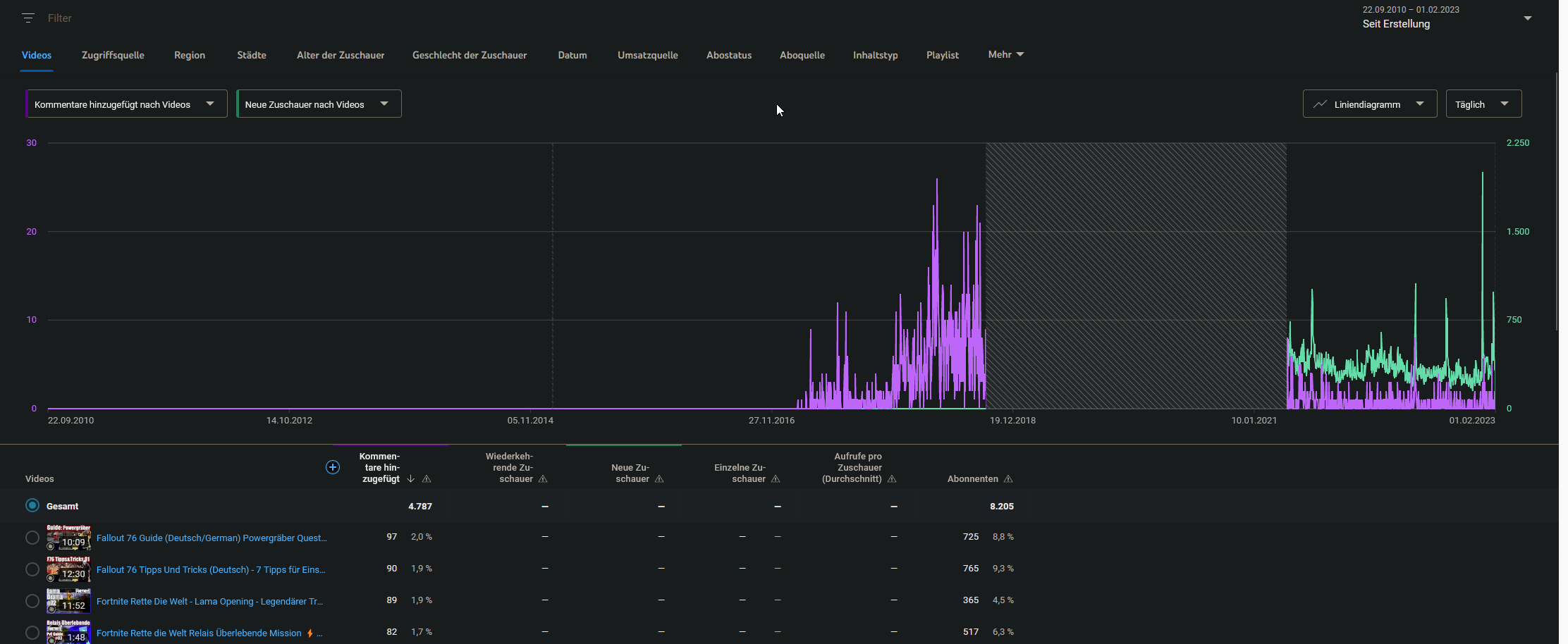 Du gehst in die Analytics, dann auf irgendein "mehr Anzeigen". Danach stellst Du sicher, dass oben Links "Videos" ausgewählt ist und dann wählst Du im linken Dropdown am oberen Rand "Kommentare hinzugefügt" aus, das steht bei mir links unten in der langen Liste an möglichen Parametern. Wenn Du dann noch oben rechts den Zeitraum auf "Seit Erstellung" änderst, sollten eigentlich alle Kommentare auf dem ganzen Channel bei "Gesamt" angezeigt werden und die Top-Videos mit den meisten Kommentaren direkt darunter.